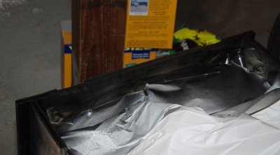Painting the edges black so that when the T-molding and the vinyl sheeting is applied, any exposed bits of wood around the edges are black and not plywood colored.